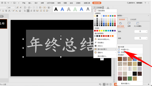 3.然后回到幻灯片当中,选中年终总结四个字,单击工具栏文本工具下的文本填充,在下拉菜单下选择图片或纹理,然后选择本地图片