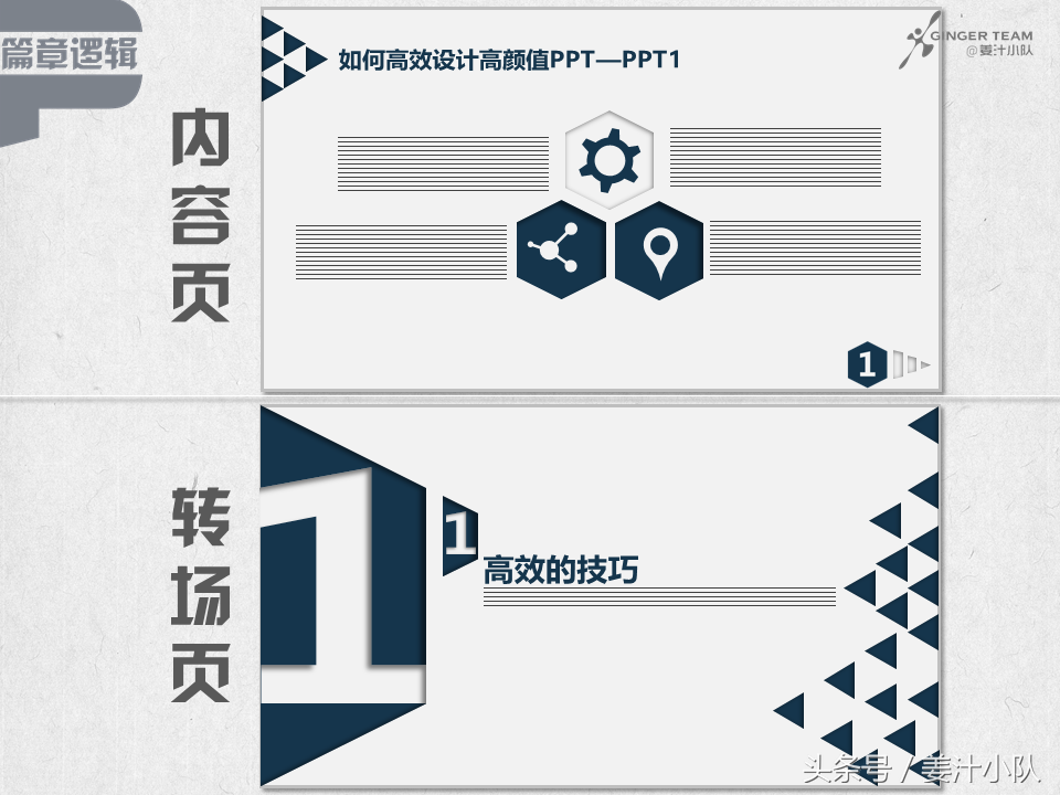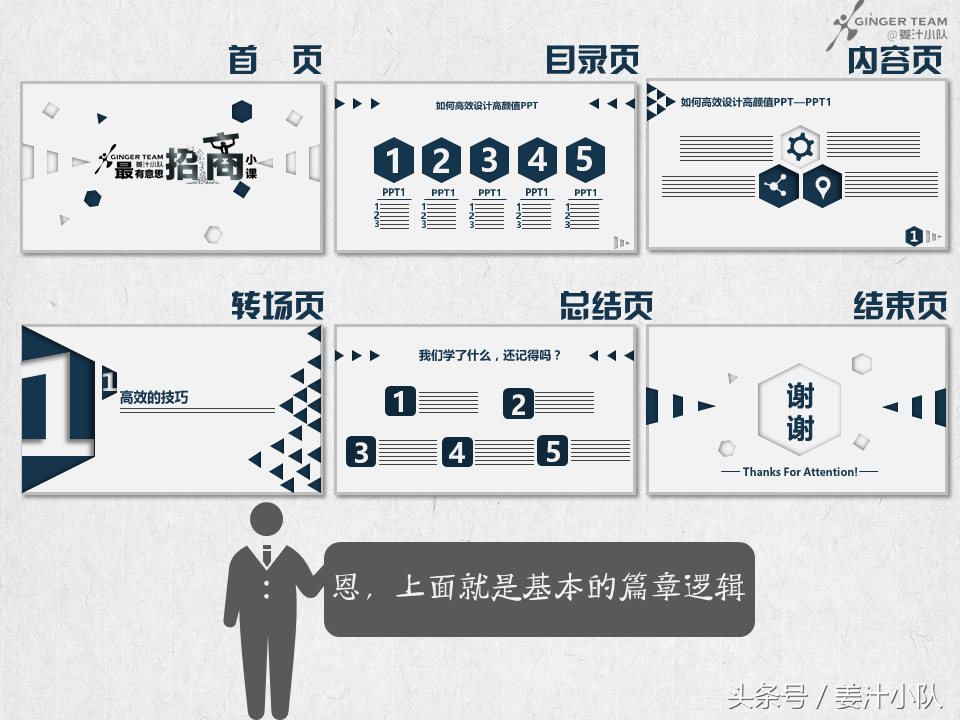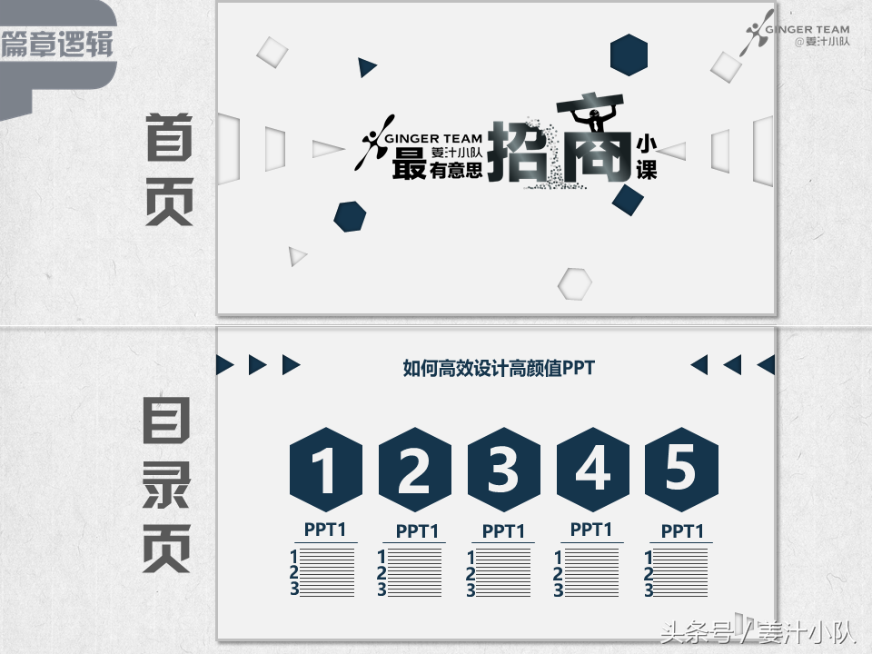 首页其实非常重要,我们以前说过封面字体(PPT封面怎么做?字体排版5大秘技首公开,从封面开始当大神),很多人认为封面其实只有个吸引眼球的作用,其实,PPT封面更重要的作用是“定调”,包括PPT的基本色、基本辅助图形、字体、图表形式等等,所以在第二课里(干掉了70%的PPT制作者,你只需要一步)我们有说过,如果要套用PPT模板,一定要完整套用、借鉴,很多半山腰上的准高手常会犯这样的错,每个模板的逻辑、配色等都是一系列的,PPT不是视频,混剪必然会导致整体不统一,结果就是——难看。