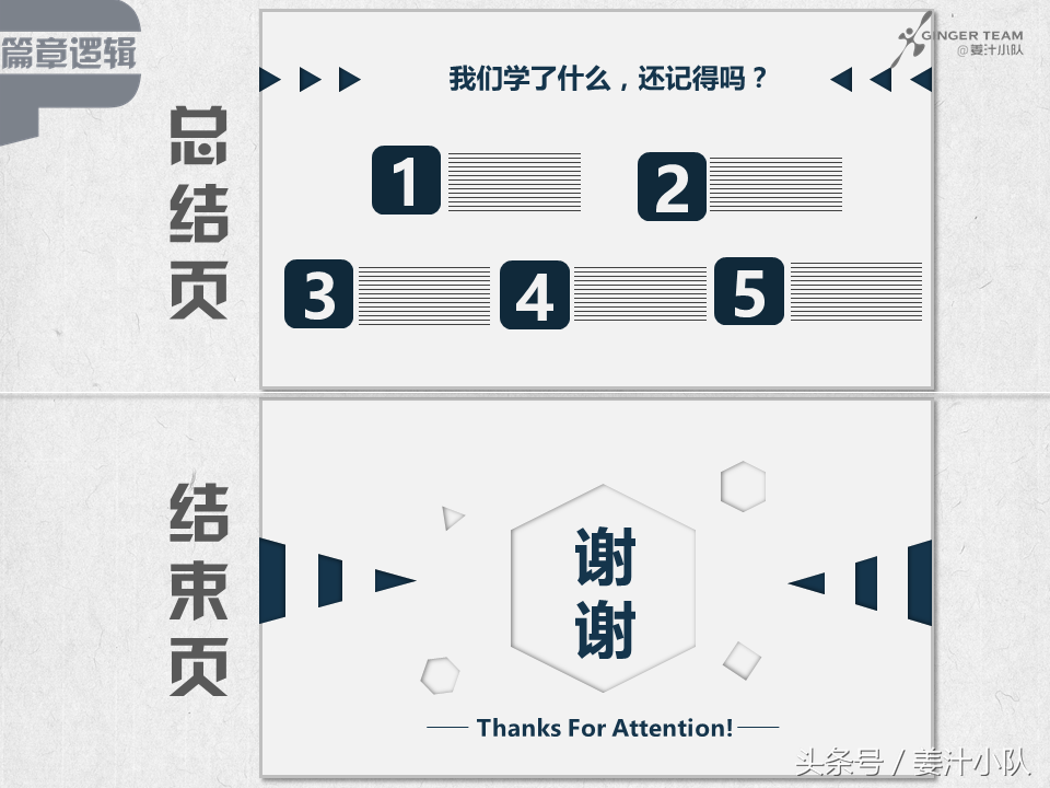 有心机的家伙一定会加这么一页!因为人的关注曲线是U型的,所以目录页和总结页,才是最让人能记住的哦,亲,做个有心机的家伙吧~