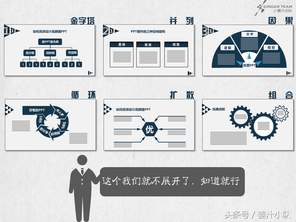 金字塔、并列、因果、循环、组合、扩散……额,这个实在没有什么说的了,知道就行,搜PPT的时候也可以这样找哦。