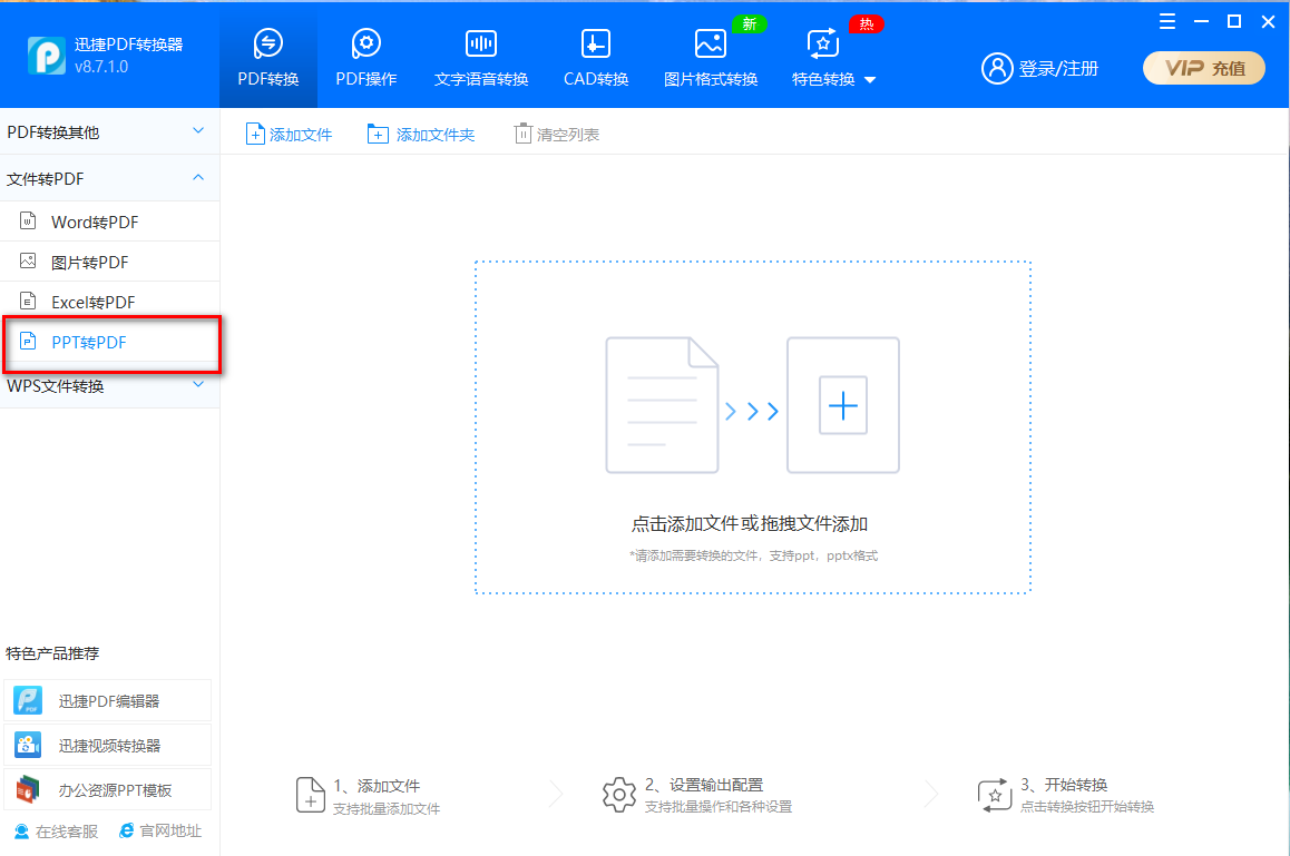 PPT转PDF的选项在"文件转PDF"分类之中,点击该选项之后将目标文件拖拽到迅捷PDF转换器,之后点击开始转换,等待几分钟即可完成。除了常规的文件格式转换以外,还能对PDF文件进行编辑操作,其中包括PDF合并、PDF分割、PDF压缩、PDF页面提取、PDF加密等等。