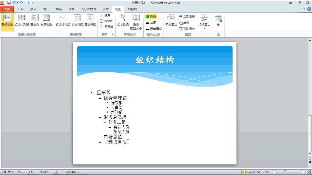 选定文本→右击转换成smartart图形→组织结构图→动画→浮入→效果选项→一次级别