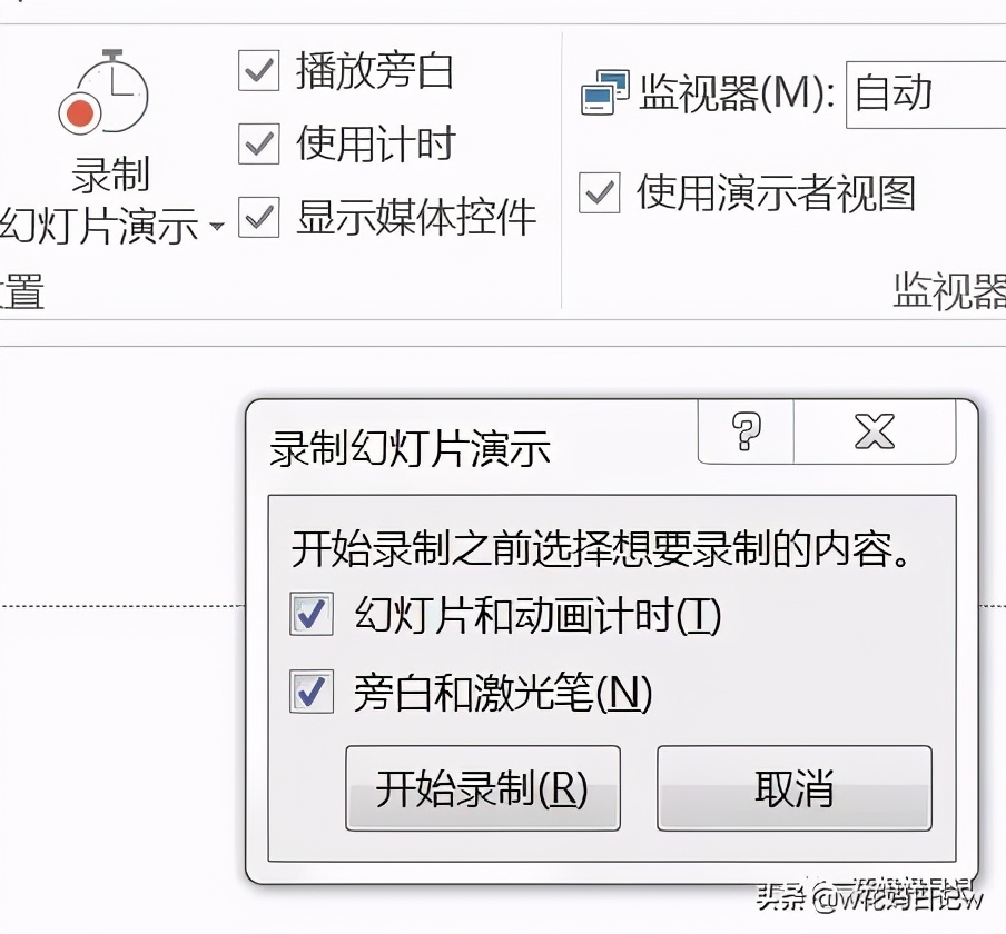 2.第二步,打开PPT(2010及以上版本)点击“幻灯片放映”——“录制幻灯片演示”;勾选旁白,就是可以同步录入声音;也可以不录声音,估计好每一页需要的时间,后面再把音频和视频拼接到一起