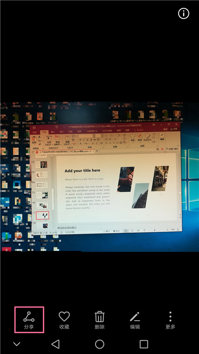 首先我们打开手机的相册,找到我们要整理成PPT的图片,随意点开一张,这时候我们可以看到左下角有一个【分享】的按钮,点击它~