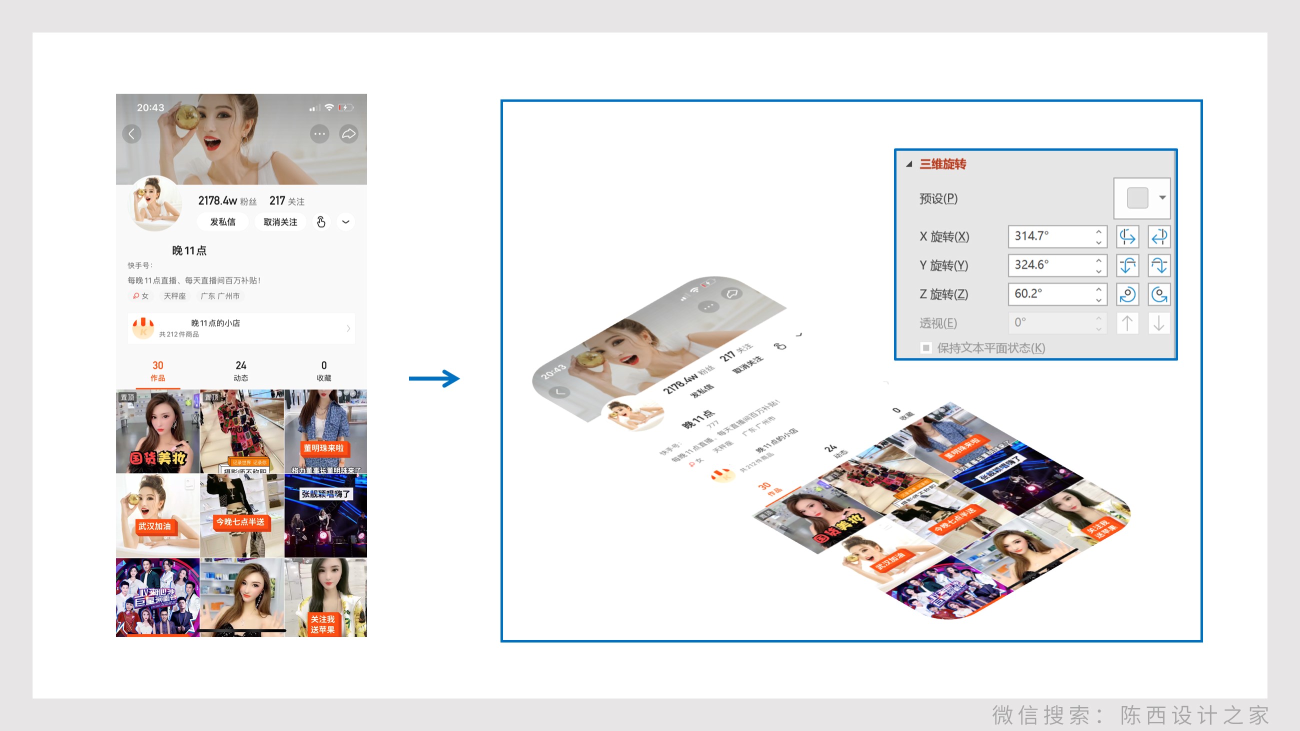 首先将手机截图做一下三维旋转的处理。因为我们的样机模型就是三维透视的效果。这个是和下载的素材有关的。