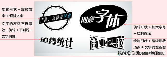 创意文字就是根据文字的特点,将文字图形化,为文字增加更多的想象力,比如拉长或美化文字的笔画、使用形状包围文字、采用图案挡住文字笔画等。有些设计会比较复杂,甚至需要使用Photoshop这样的专业图形图像处理软件来制作好完整的图像,再将其插入幻灯片中。下图所示为几种简单的创意文字效果。