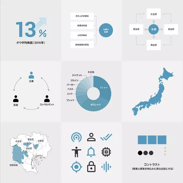 以上介绍了关于图表、插图、icon的各种技巧,但制作的时候把这些元素放在一起就要考虑统一感了。这包括配色、字体和字号、留白和质感等。