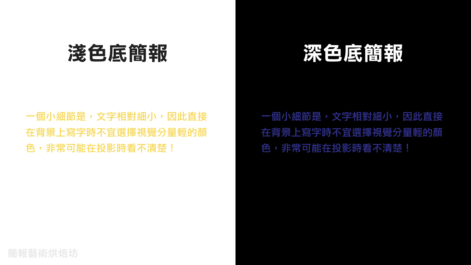 小细节是,对比色中孰轻孰重会视颜色与背景的差异而定,浅色系PPT与深色系PPT上可能截然相反,从以下的图就可以看出这个差别。