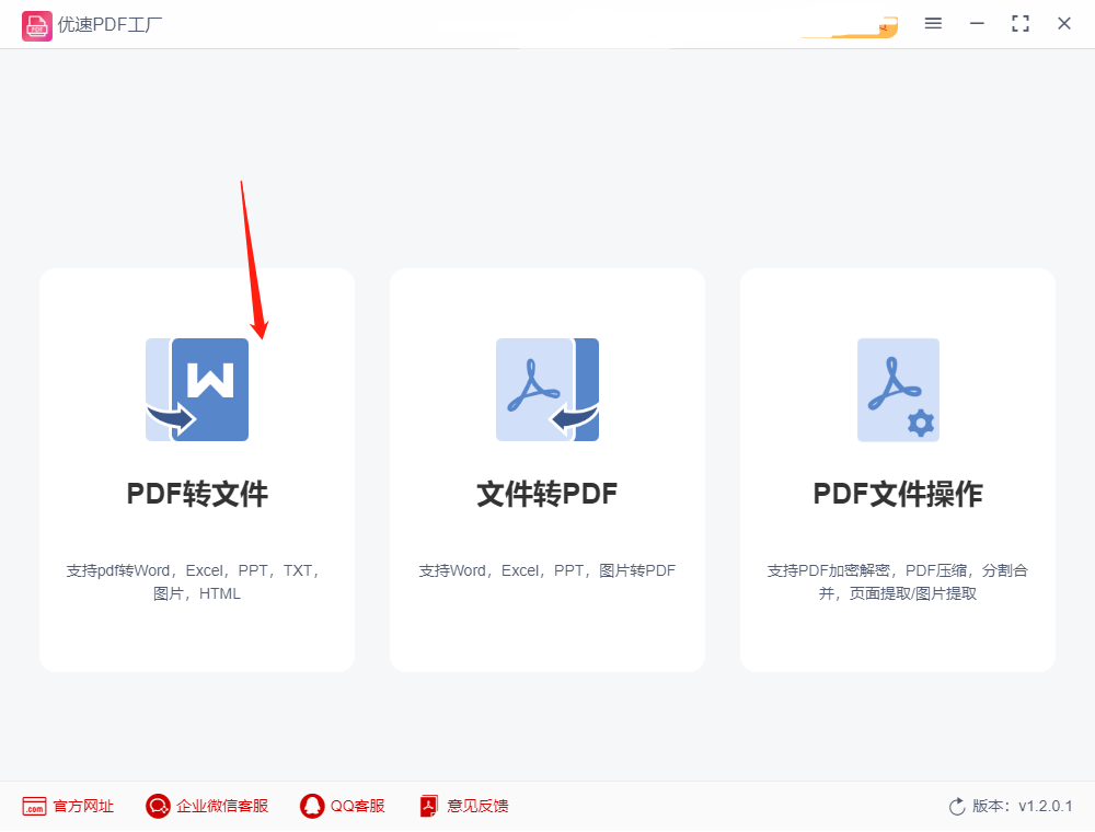 流程一、首先在电脑端下载运行“优速PDF转换器”工具软件,然后在软件首页点击【PDF转文件】功能项。