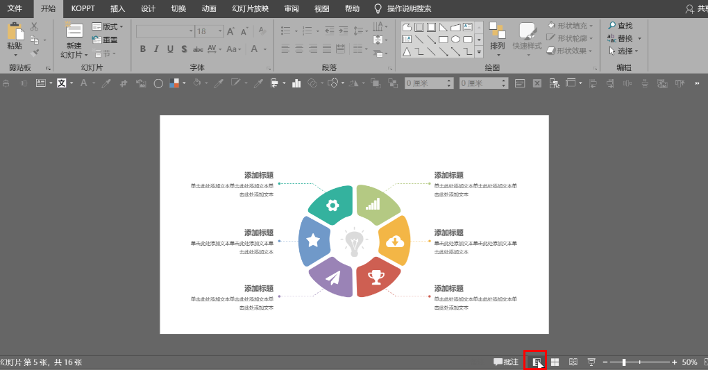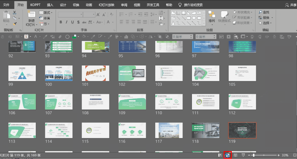 此时,可以点击PPT右下角的【幻灯片阅览】功能,可以将页面成组显示出来,同时还能通过【Ctrl+鼠标左键】缩放阅览页面。