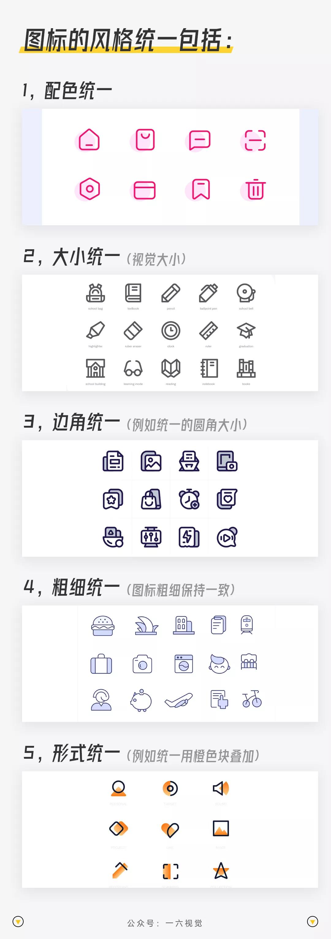 通常来说,以下几项内容保持一致,便能保证图标的风格是统一的: