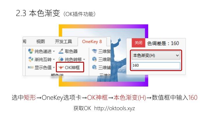 这一步使用OK神框中的本色渐变(H),将纯色转为渐变。本文示例数值是160,意思是第二个光圈的色调值与原来的颜色色调值相差160,也可以根据实际情况选择恰当的数值,160仅为本文示例数值
