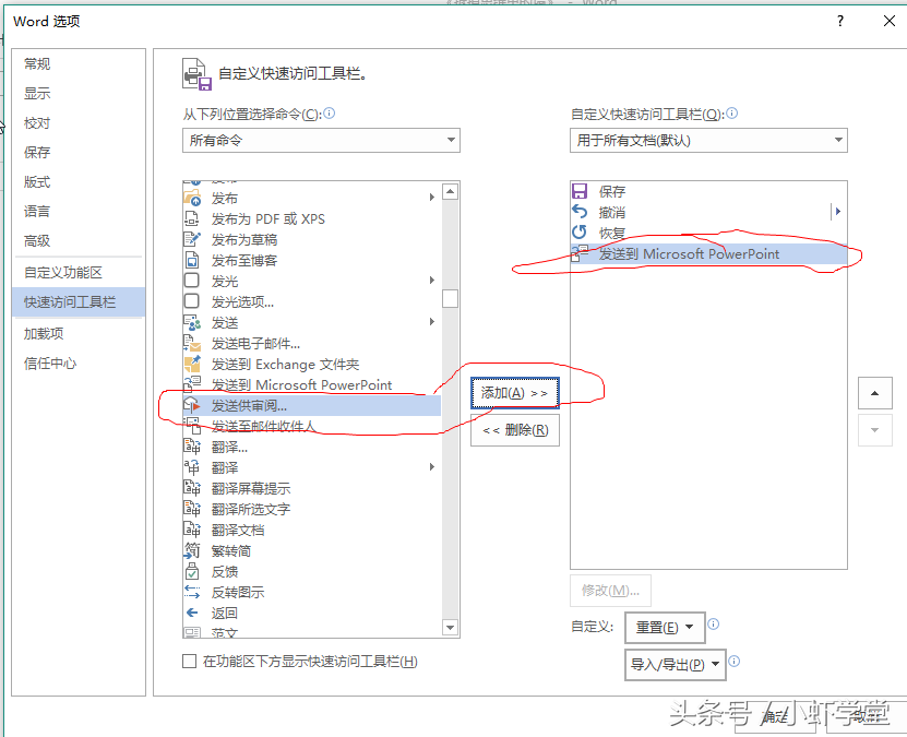 在word中点击文件,然后点击选项按钮,我们就可以看到word的各种设置和功能。点击快速访问工具栏,选择所有命令,找到”发送到Microsoft powerpoint“功能,选择添加。