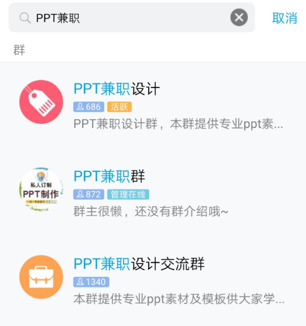 1.当你有一技之长时,你会发现,只要努力,就一定能赚到钱!每一年,我只给自己立一个小小的flag:暴富!而我,在2019年,找到的新方法,做PPT!!这里请注意,在客户虐你千百遍的时候,心中默念,客户是上帝,客户是上帝!那么,该去哪里找到PPT兼职呢?方法一:万能的某宝搜索“PPT定制/代做”,选择你喜欢的,一对一私聊客服,需要PPT设计师么?你会发现,打开了新世界的大门~~同理可找到:美工,平面设计,翻译,文案......方法二:万能的企鹅搜索企鹅群“PPT兼职”,加入,私(勾)聊(搭)群主/管理,然后,关注接单就可以了企鹅还有很多好玩的,以后再说方法三:各种设计网站不想被客户虐,还有一种方法,去各大设计网站申请入驻,上传几百套原创模板,可以躺着赚钱了~~~最后:温馨提示,先学会PPT再说,会做何做好是两件事!