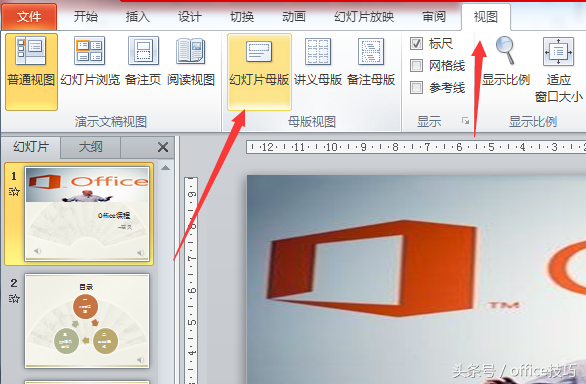 3.打开PPT软件后,点击“视图”选项卡→“幻灯片母版”按钮。