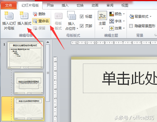 4.在“幻灯片母版”选项卡中点击“插入版式”命令,你还可以使用“重命名”命令给他改名字