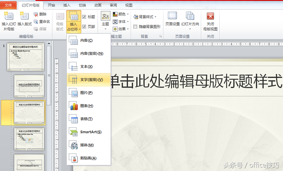 2.在设计版式的时我们需要借助幻灯片母版,适当的使用占位符,这样我们就能创建一种满足自己要求的版式了。