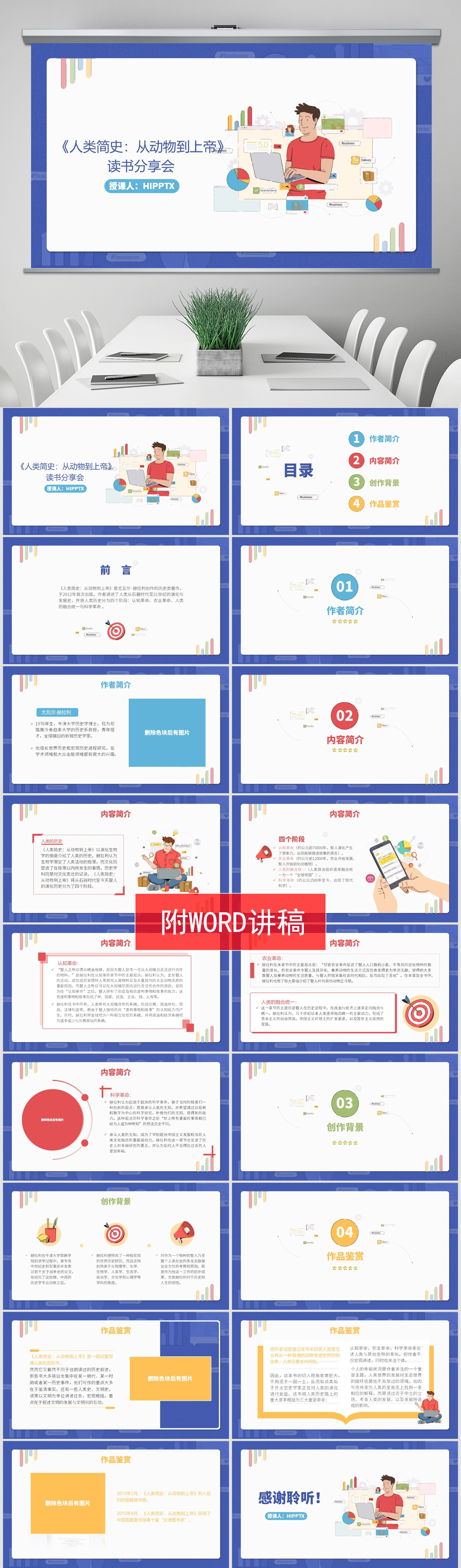 7.好书推荐《人类简史:从动物到上帝》 读书分享会ppt课件共有18页,文稿字数为1953,带内容、带文稿的ppt课件,内容详实,主题明确。