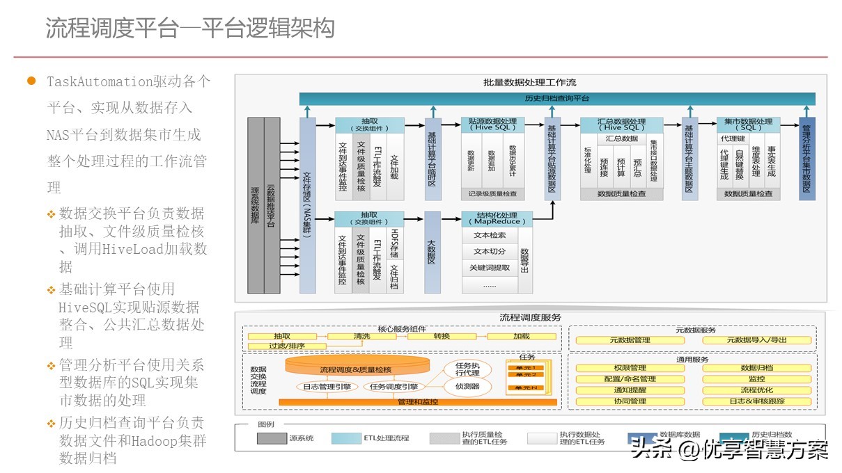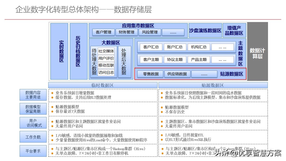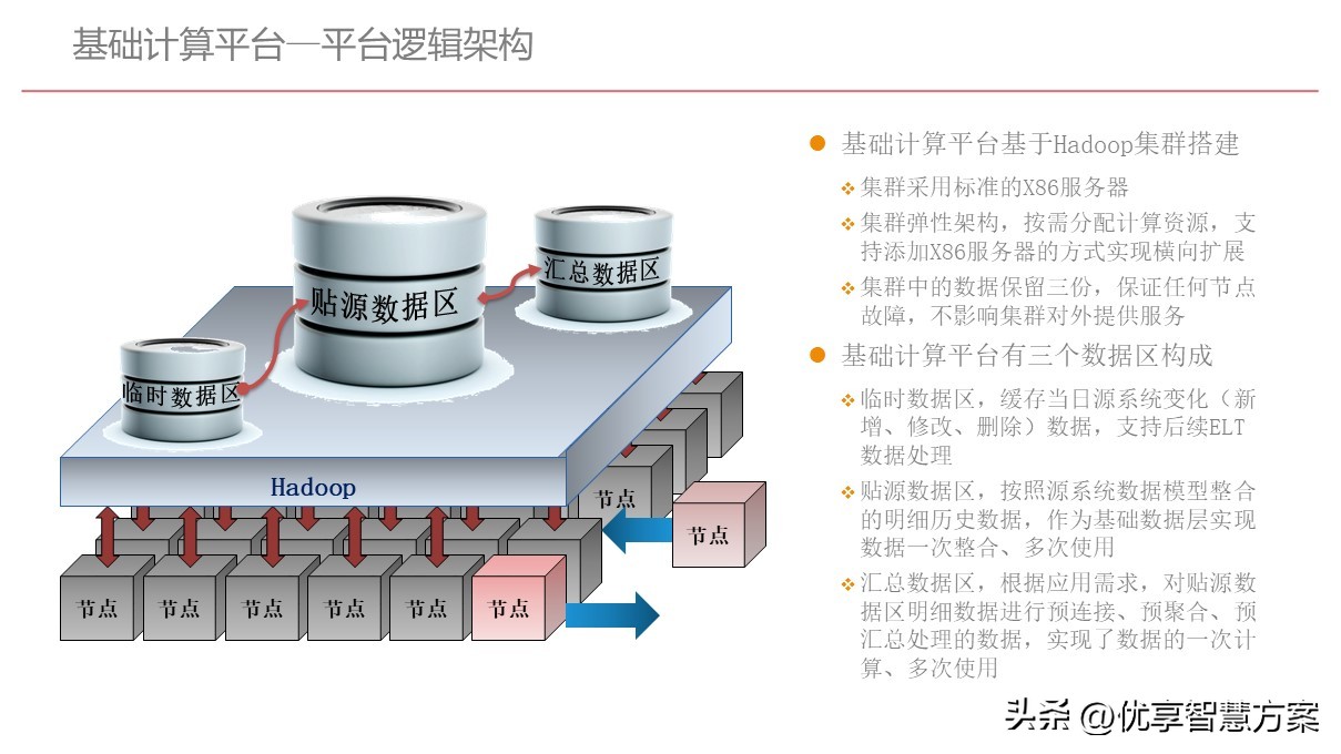 - l基础计算平台:基于Hadoop集群构建,按照业务条线、以贴源数据模型存储了业务系统明细数据