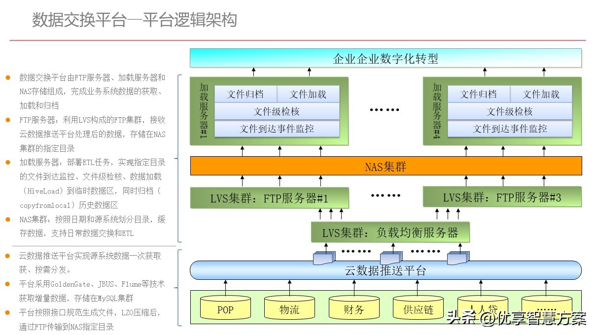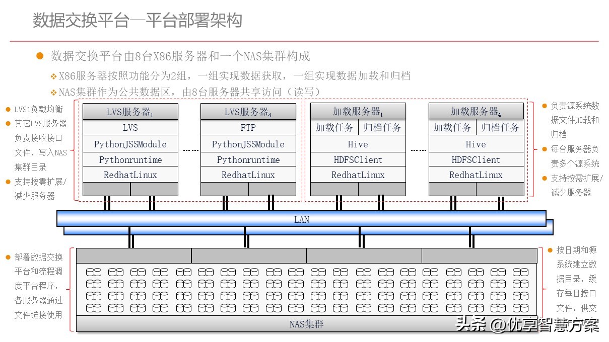 - l数据交换平台:NAS集群实现了进出数据平台数据的暂存,业务数据交换组件实现了业务系统每日增量数据加载,数据区数据交换组件实现了基础计算平台与管理分析平台间的数据交换