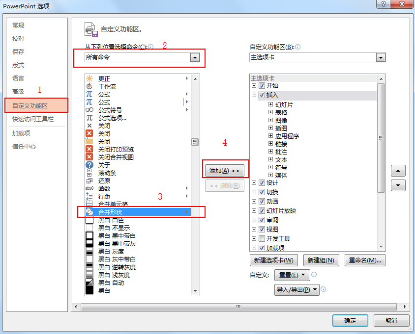 1.调出布尔运算功能第一步:打开PPT,“文件”-“选项”-“自定义功能区”第二步:点击“自定义功能区”的“所有命令”选项,找到“合并形状”-“添加”(添加时可以根据自己的情况新建一个组)-“确定”