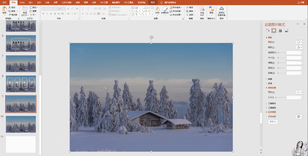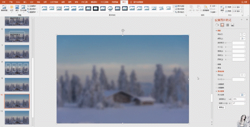 把已经添加玻璃效果的图片另存为图片后,再插入ppt中,添加胶片颗粒效果,之后与毛玻璃制作方法相同。