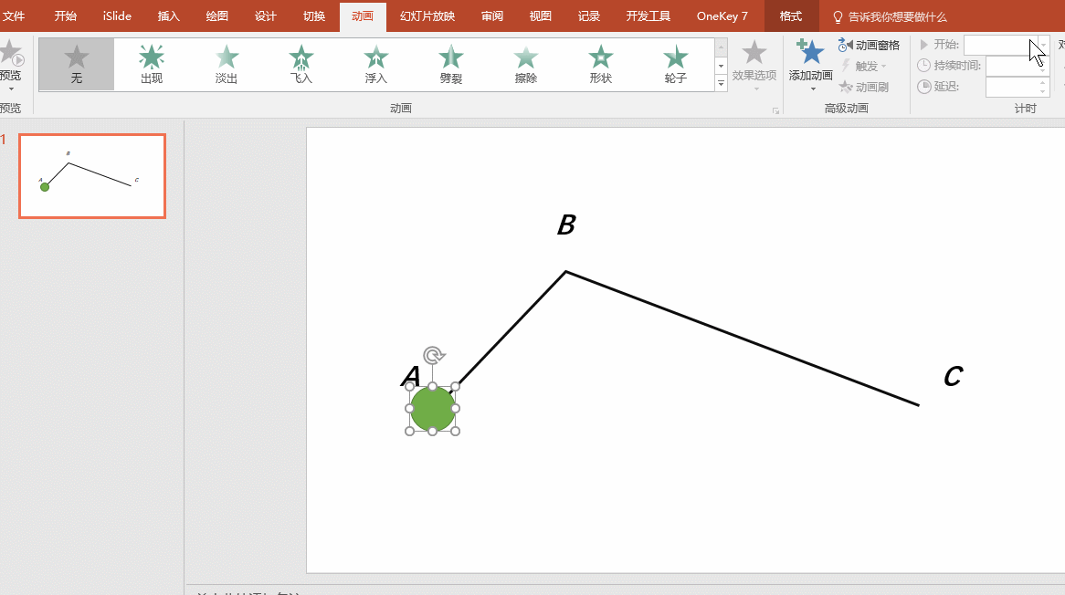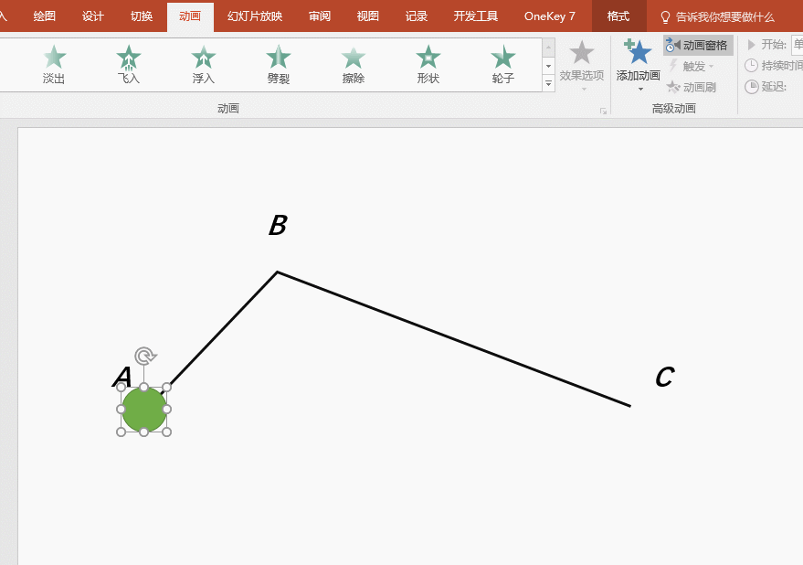 很明显的,这种设置方法,绝对是一口气ABC演完,无法实现小伙伴们的先从A到B,B再到C的动画设置。如果要设置分开的动画,就只有分开的动画设置。但设置方法需要,请看下动图操作: