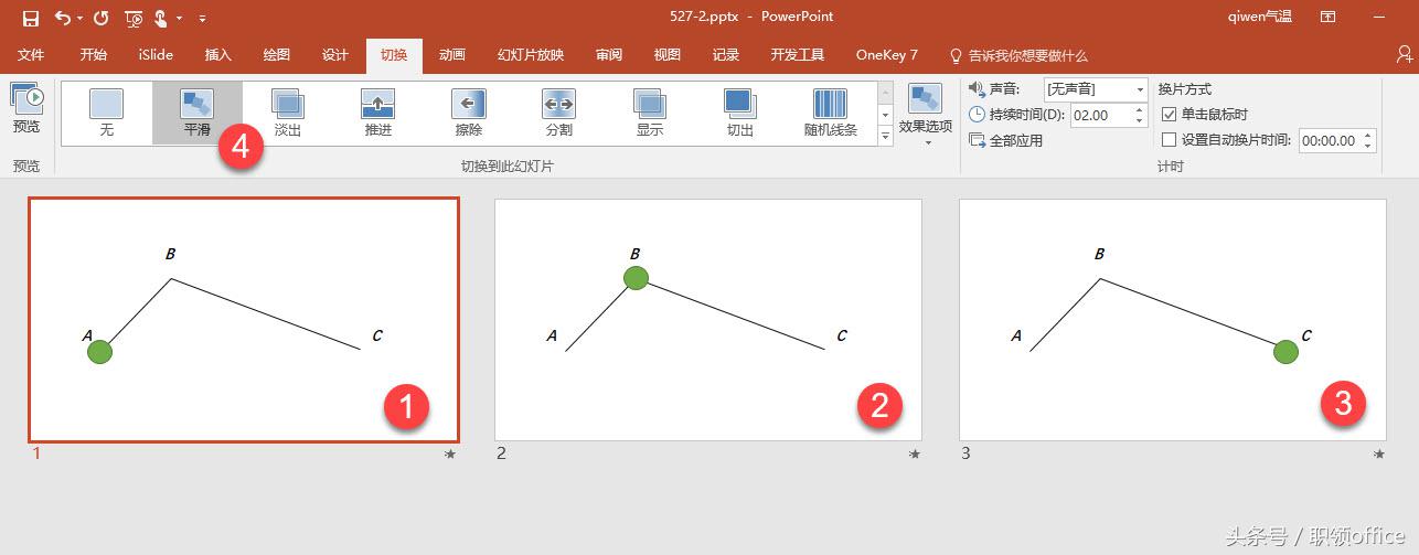 具体方法如下,分别移动圆点位置,并复制三个页面,然后ctrl+A全选,设置平滑动画。下图4处。F5播放PPT动画即可。动画完美。