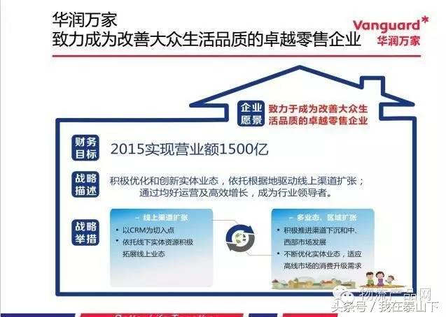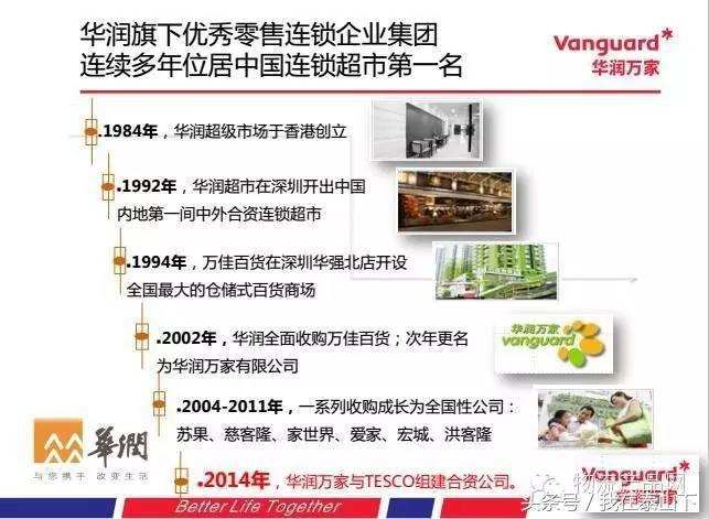 华润万家作为华润集团旗下优秀的零售连锁,1984年成立于香港,1992年在国内开出第一家连锁零售超市,从2002年开始直至2011年,陆续完成对苏果、家世界等一系列收购,成长为全国性的公司。2014年华润万家完成对于乐购中国区业务的收购,已经连续位于中国连锁超市第一名多年,在2014年实现营业收入1048亿,2015年将通过两大关键线上业务的扩张,全业态业务的扩张,争取实现1500亿的财务目标。