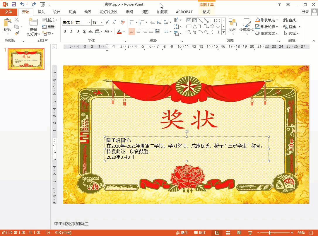 由于幻灯片大小可能和图片大小不一致,导致奖状证书模板显示不全。可以单击将图片平铺为纹理前的小方格使其打上对勾,然后再次点击去掉对勾,图片就自动适应幻灯片大小了。