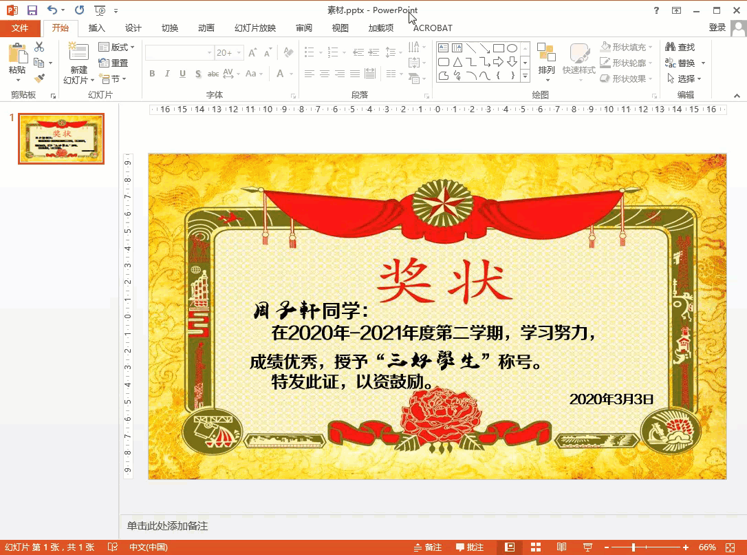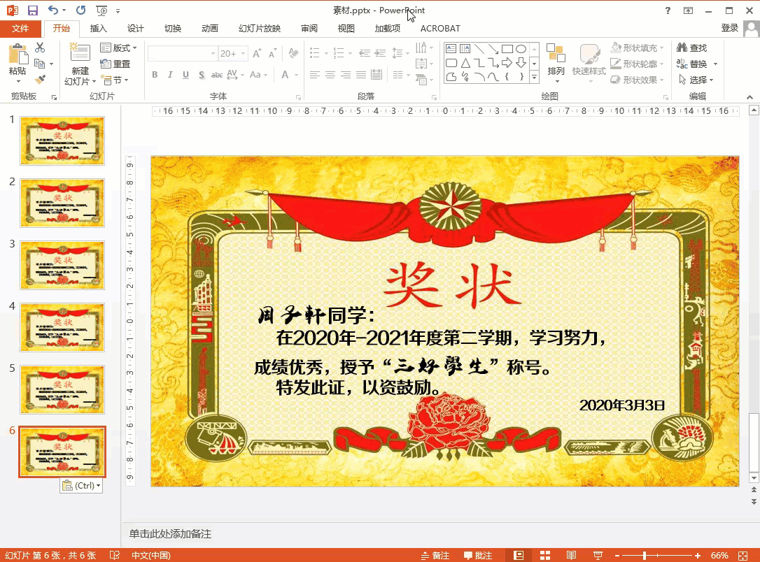 同时按下键盘上的Ctrl + A键,全选文字,将文字字体设置为自己喜欢的字体,然后加粗文字。最后可以将姓名和称号更换为手写字体,看起来更美观。全部设置完成后,点击视图区中刚刚完成的奖状证书。同时按下键盘上的Ctrl + C键复制幻灯片,然后在同时按下键盘上的Ctrl + V键粘贴幻灯片。可以根据受嘉奖的学生数量进行设置。然后对后面粘贴后的幻灯片进行改名处理。