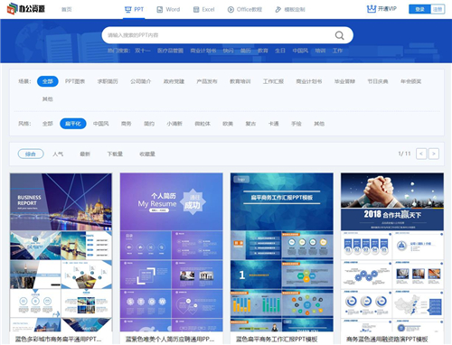 当然这种扁平化风格的PPT虽然显得非常高级好看,不过手动制作起来可能不太好制作。那么我们可以取巧,登陆办公资源网,选取PPT模板,选择扁平化风格,直接套用进PPT就可以了。当然办公资源可选的风格非常多,还包括中国风、商务、微粒体等等,也非常好用。