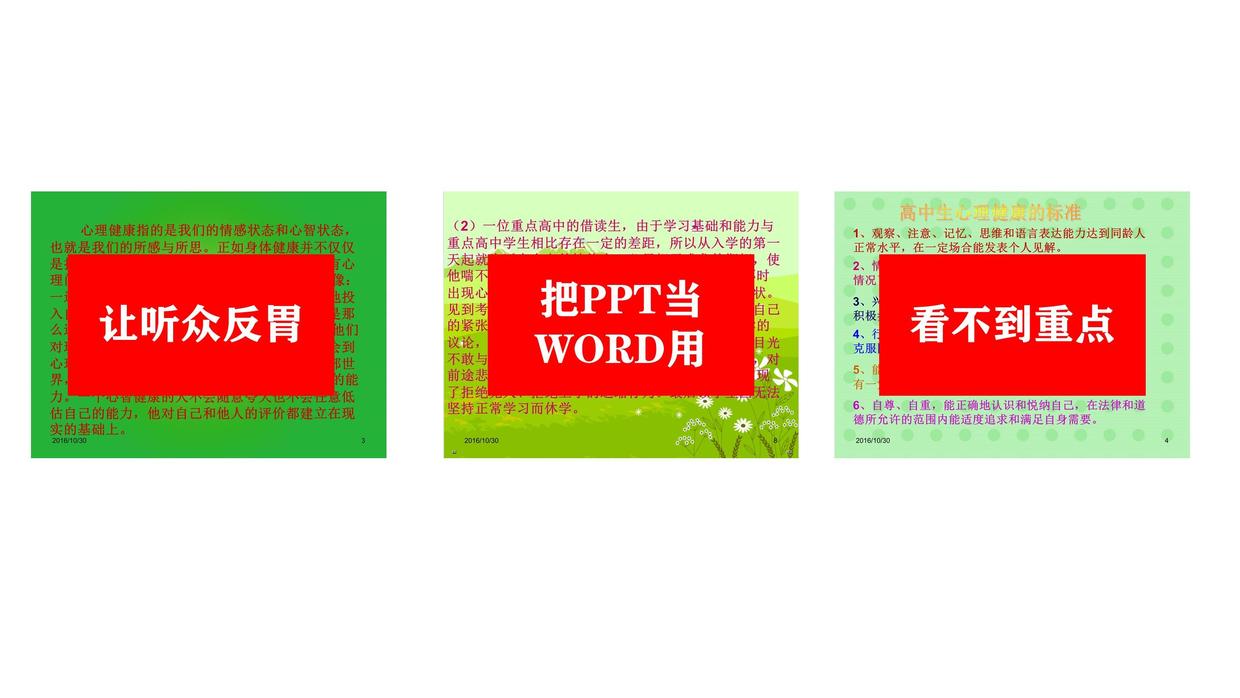 (1)看着反胃。一看就恶心,再也不想看第二眼。这样的PPT就不要拿出来啦,吓人!
