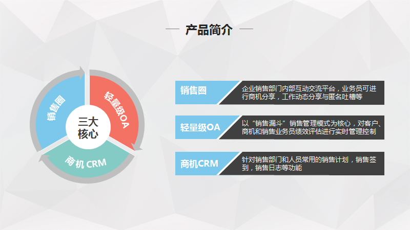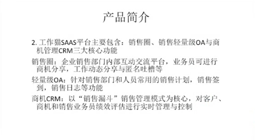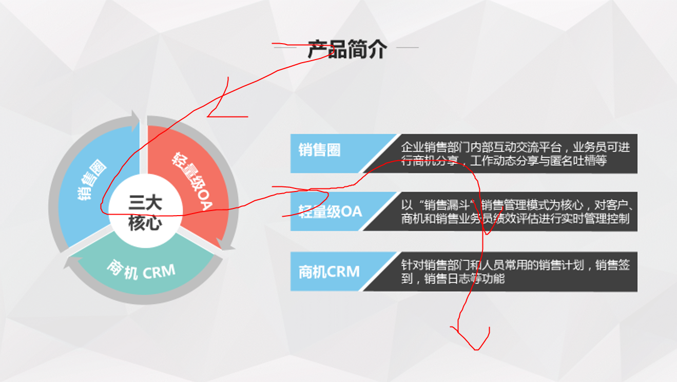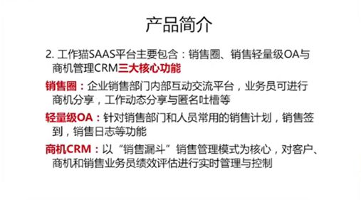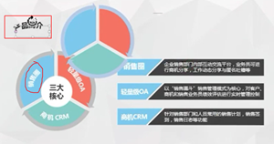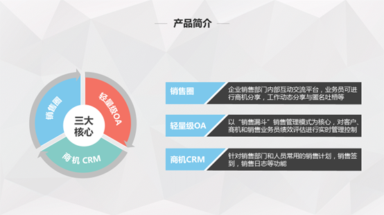 “分”(介绍三大核心功能是什么)————“销售圈”、“轻量级OA”、“商机CRM”,然后是每个核心功能的具体详细介绍。