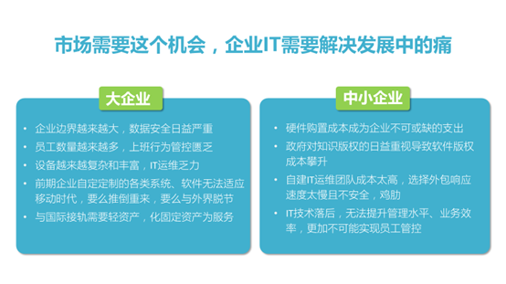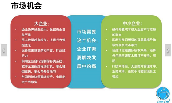 利用两个色块将他们给区隔了,并且给色块加上阴影,这样大家一眼就能看清这两类型的企业面临的机会和问题。两个青绿色色块的运用丰富页面的同时也凸显出了两个模块。