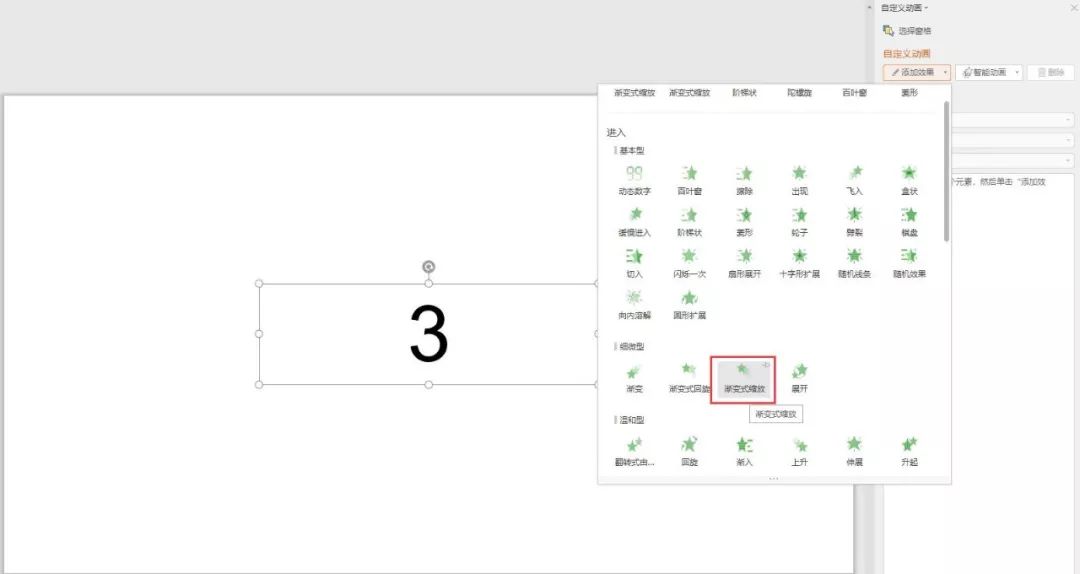 ◆选中该文本框,点击菜单栏“动画”-“自定义动画”,点击“添加效果”下拉按钮,“进入”和“退出”效果均选择“渐变式缩放”。
