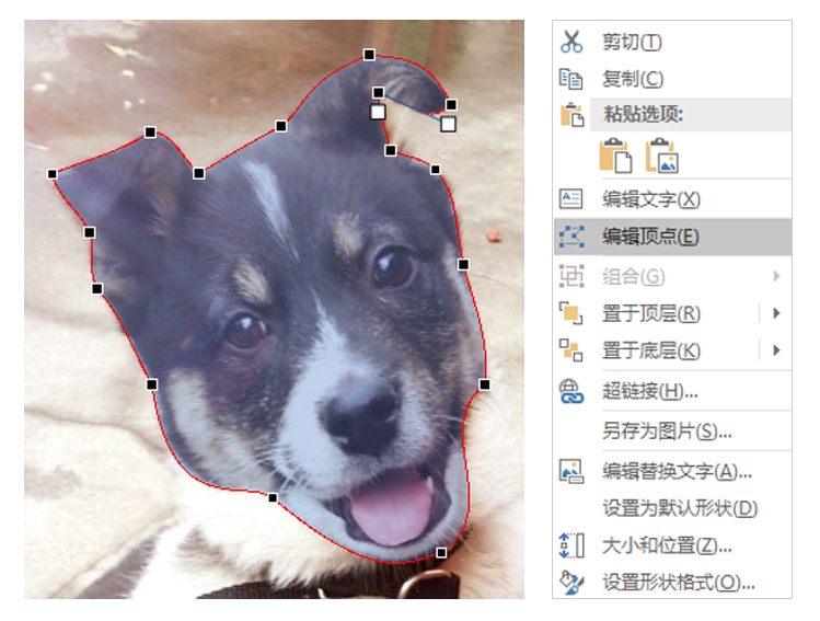选中这个这个形状-右键-编辑顶点,开始沿着底部的小狗头部轮廓进行调整形状的曲线。