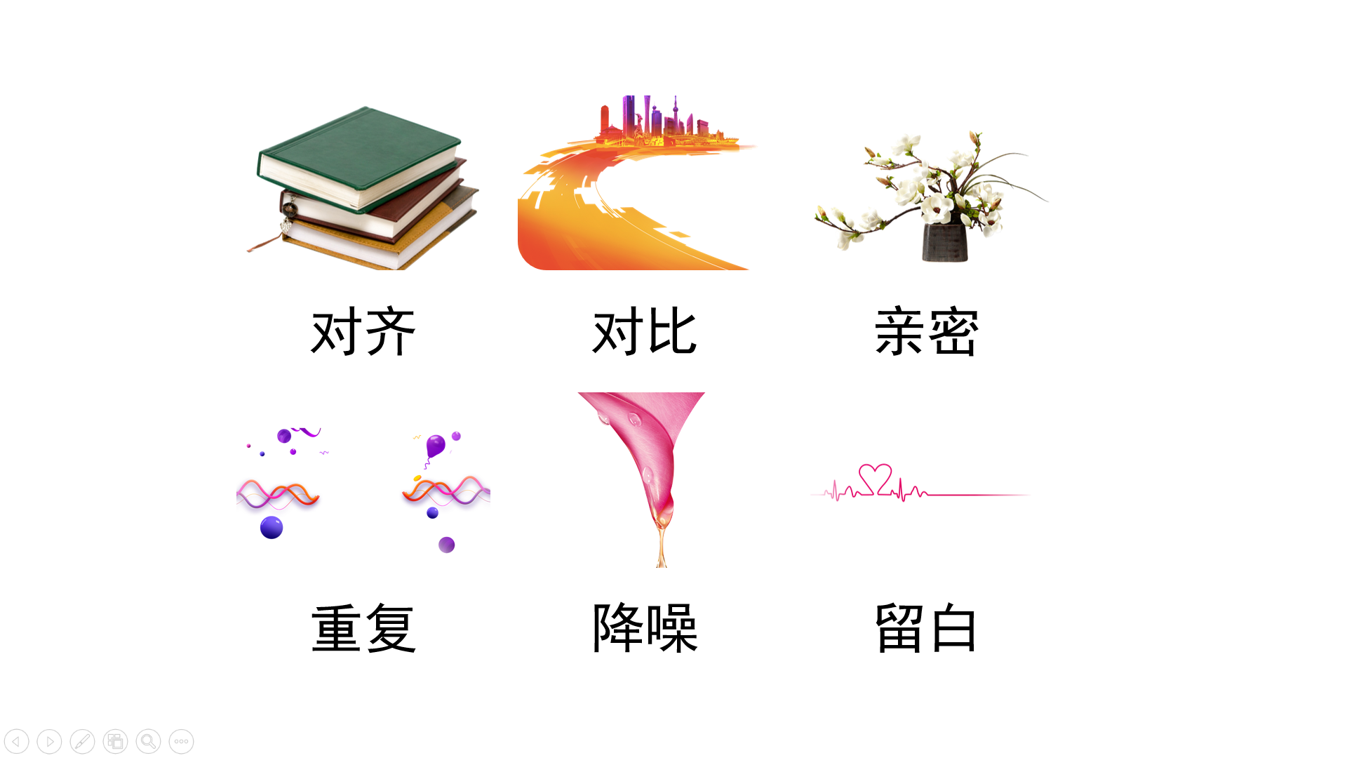 文字动画以淡出、出现、上浮等动画为主;图片的动画更具其内容选择适合的动画类型。