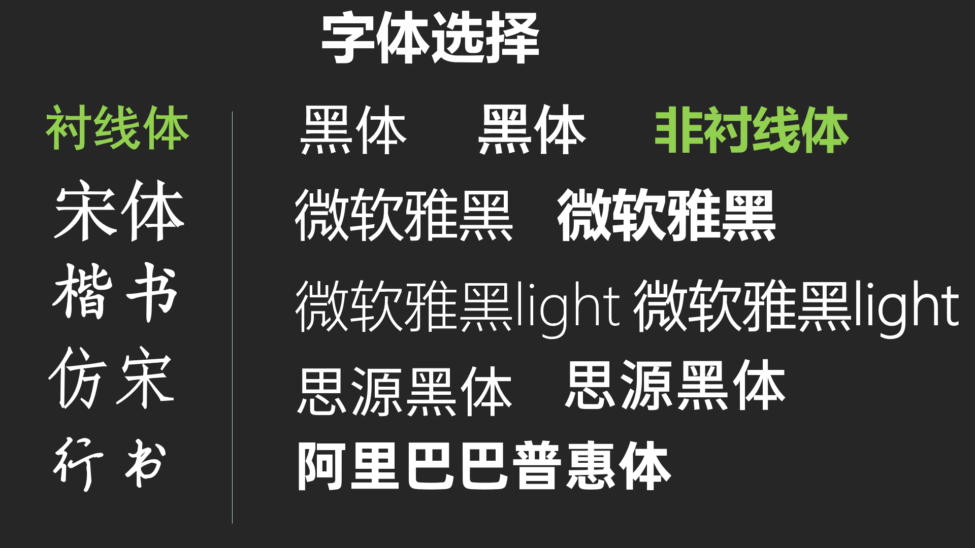 特别注意的是,微课的字体的正文部分一般情况下不用衬线体,如尽量少用宋体;而多用非衬线体,如各种黑体、等线体等均可。微课常用的字体,如微软雅黑、思源黑体、方正黑体以及最近阿里巴巴普惠体也很不错。