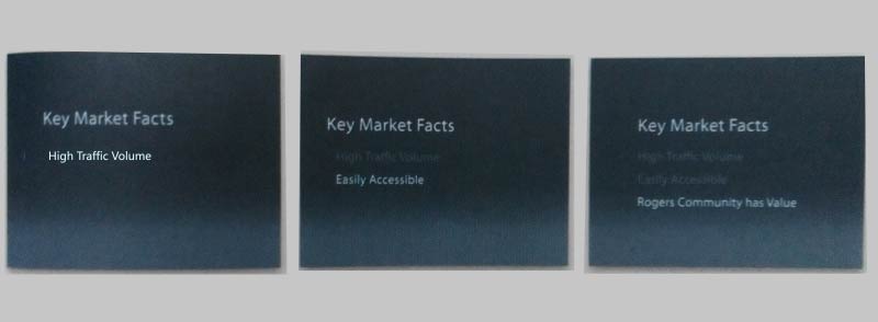 在一张幻灯片上,根据演讲的顺序依次列出要点。突出显示大标题,它提示观众要点所属的类别。如果列出的要点较少,这没有必要。但如果要点很多,大标题就很有帮助。注意,每当一个新的要点呈现的时候,前一个要点要隐去。所有要点都很简短。