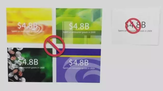 在模板上看,背景都很漂亮。但加上文字以后,无关的图形削弱了其可辨性,散发出干扰信息。一般来说,应使用简单的深色或柔和的中性色背景,避免使用纯白色如上所示),在幻灯片上它显得太扎眼。