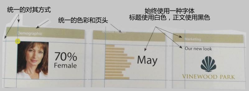 内容(尤其是图片内容)变换可以很大。重复使用颜色、字体和板式,使所有内容保持统一。将幻灯片划分为不同区域,保持内容在各个区域内。