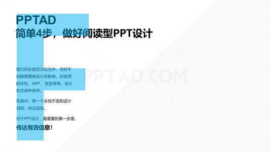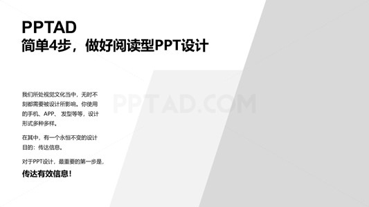 我们所处视觉文化当中,无时不刻都需要被设计所影响。你使用的手机、APP、 发型等等,设计形式多种多样。在其中,有一个永恒不变的设计目的:传达信息。对于PPT设计,最重要的第一步,是传达有效信息!