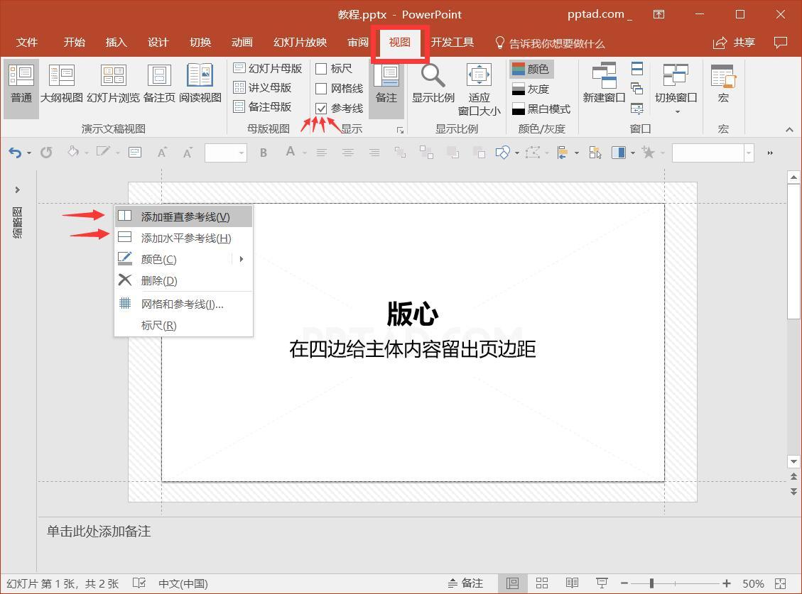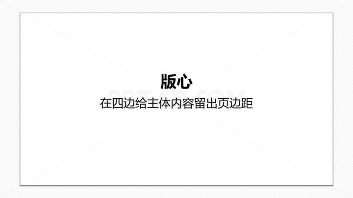 版心里面放的是主体内容,但不是任何内容都不能超出这个范围。一开始应用版心,可在PPT里添加水平与垂直参考线。熟练之后,大可不必套着参考线来做,心中默默应用这个概念即可。下面为操作方法。