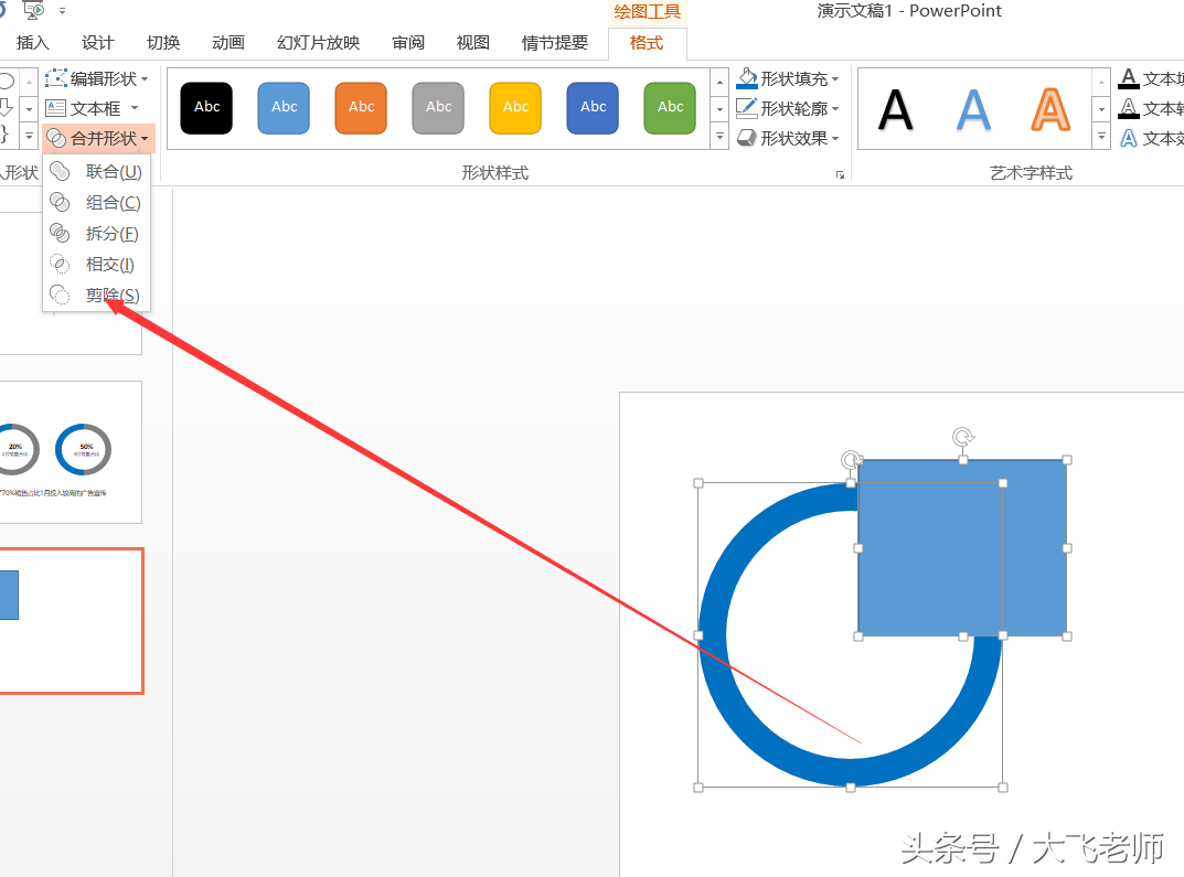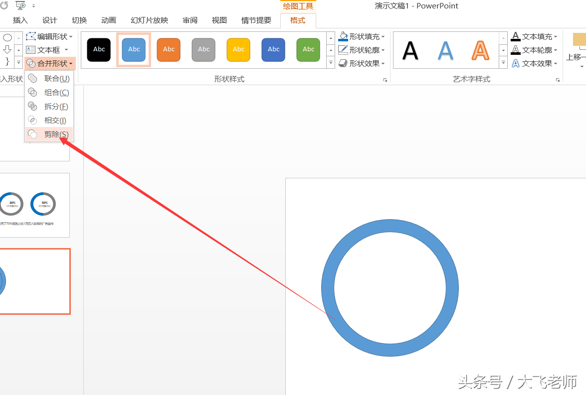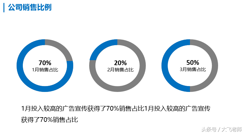 大飞老师带大家制作一个PPT软件中常见的圆环图的制作,只不过这个图是通过PPT的形状工具的设置实现的。(PS:我使用的版本是PPT2013,如果是2010需要添加一些默认的工具)而工作也是较为常用的一种表现形式。我们先看一下效果图