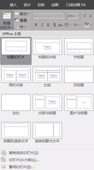 我们打开一个新的PPT,点击新建幻灯片,我们会在office主题下看到三个特别的按钮,暂时不用理他们的各自功能。