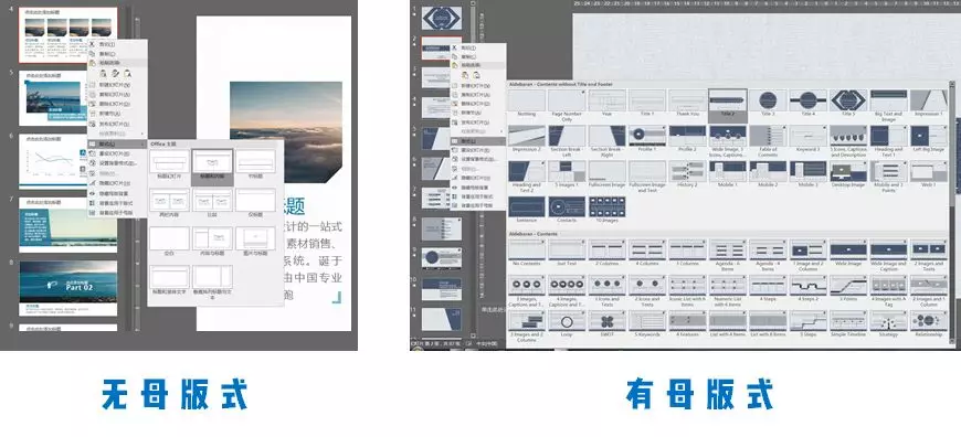 当我们使用了模板并新建幻灯片的时候,很快就可以发现两者的区别:简单文本框制作的母板可用版式为0,而使用幻灯片母版的ppt模板,在版式部分会有N种模板进行选择。
