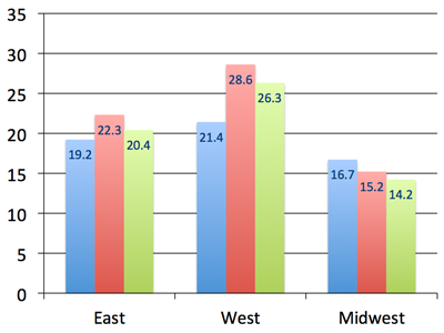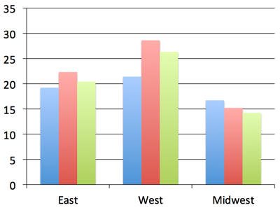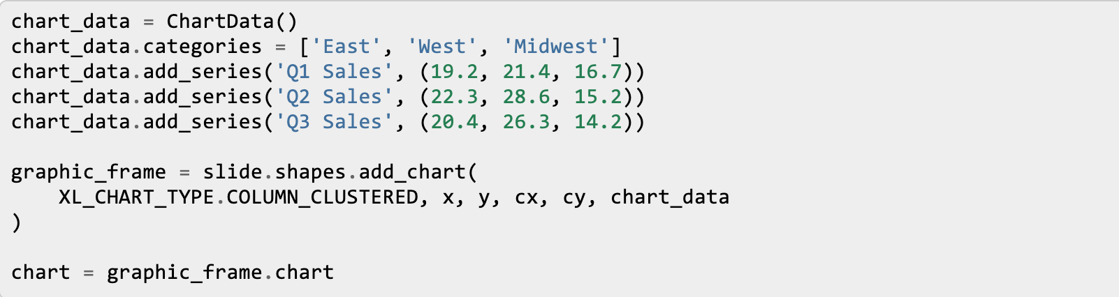 chart_data = ChartData() chart_data.categories = ['East', 'West', 'Midwest'] chart_data.add_series('Q1 Sales', (19.2, 21.4, 16.7)) chart_data.add_series('Q2 Sales', (22.3, 28.6, 15.2)) chart_data.add_series('Q3 Sales', (20.4, 26.3, 14.2)) graphic_frame = slide.shapes.add_chart( XL_CHART_TYPE.COLUMN_CLUSTERED, x, y, cx, cy, chart_data ) chart = graphic_frame.chart
