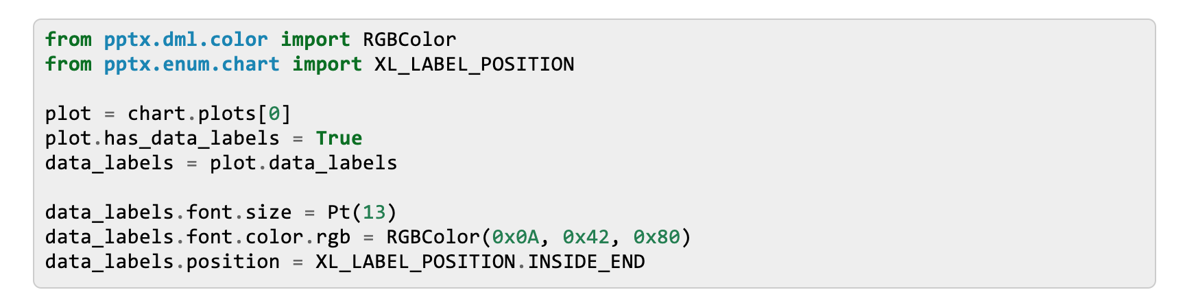 from pptx.dml.color import RGBColor from pptx.enum.chart import XL_LABEL_POSITION plot = chart.plots[0] plot.has_data_labels = True data_labels = plot.data_labels data_labels.font.size = Pt(13) data_labels.font.color.rgb = RGBColor(0x0A, 0x42, 0x80) data_labels.position = XL_LABEL_POSITION.INSIDE_END