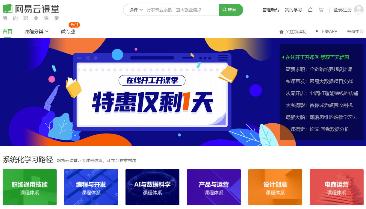 这个学习网站,也许不少朋友都有听说过,里面同样也有不少关于职场技能提升的课程。包括职场提升、编程与开发、AI/数据开发、产品与运营、设计创意、电商运营等,当然,里面也有相关的PPT教程供大家学习。
